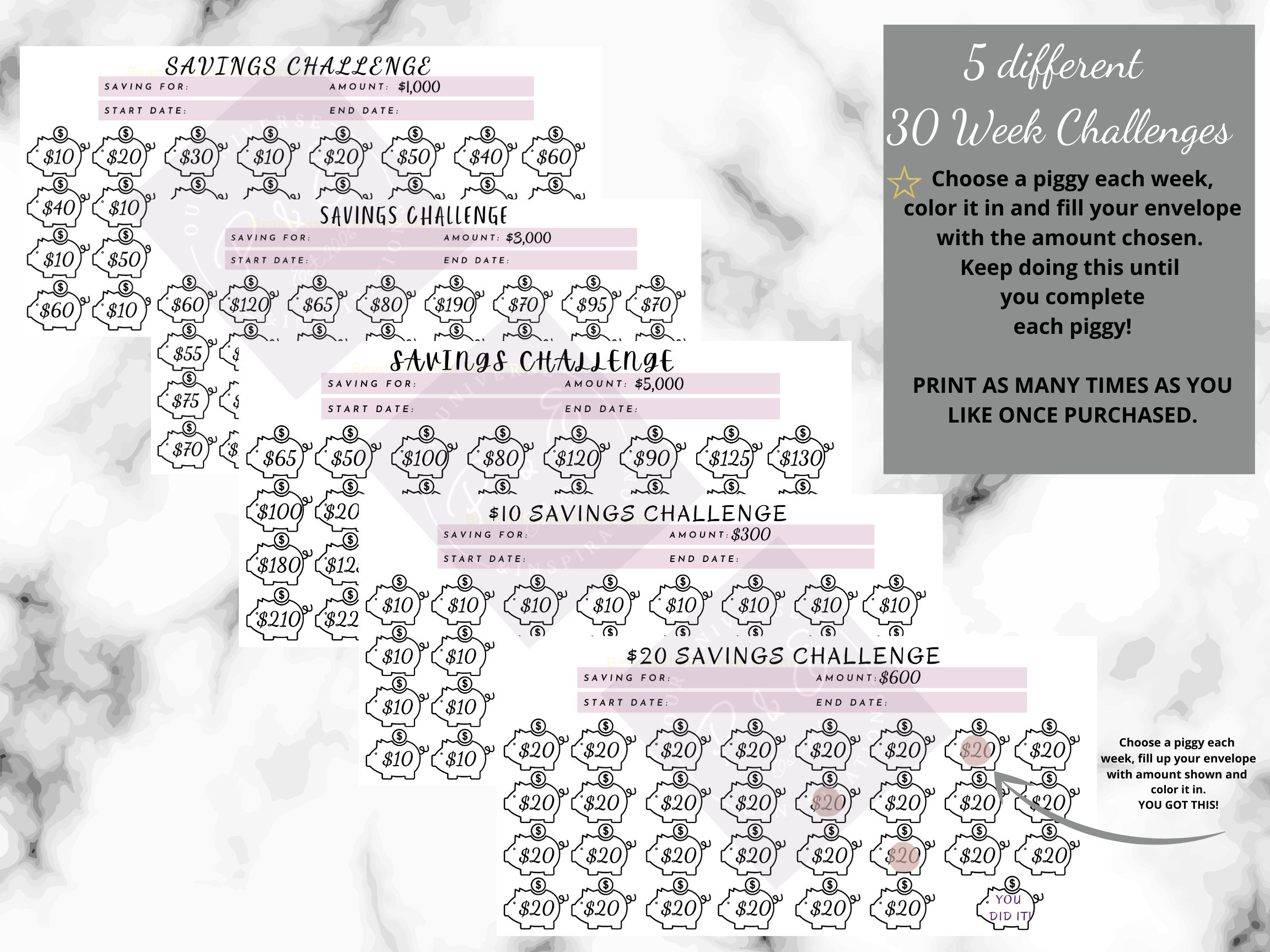 Get ready to save with these 30 week savings challenges!! Set yourself a goal to save $1k, $3k, $5k, $300 and $600 in 30 weeks! This is a digital download purchase, simply buy, download, save and print as many times as you like. These challenges are very simple and fun! YOU CAN DO THIS!!